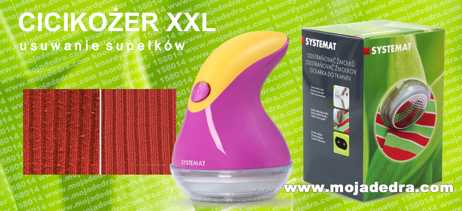 CICIKOŻER XXL usuwa supełki ze zmechaconych tkanin, zbierają się one w pojemniku. Skutecznie usuwa supełki i grudki z wszystkich rodzajów tkanin. CICIKOŻER XXL posiada zintegrowany akumulator. Jest bardzo prosty w obsłudze. Ma ergonomiczny kształt, ładowarka jest dołączona do zestawu 220V. Urządzenie posiada instrukcję obsługi. Wykonane z wytrzymałego tworzywa sztucznego i metalu.