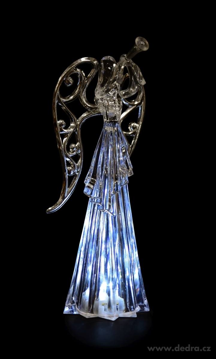 Duży anioł z podświetleniem, wykonany z przezroczystego twardego tworzywa sztucznego z diodą LED wewnątrz. Ozdoba ładnie świeci w ciemności.