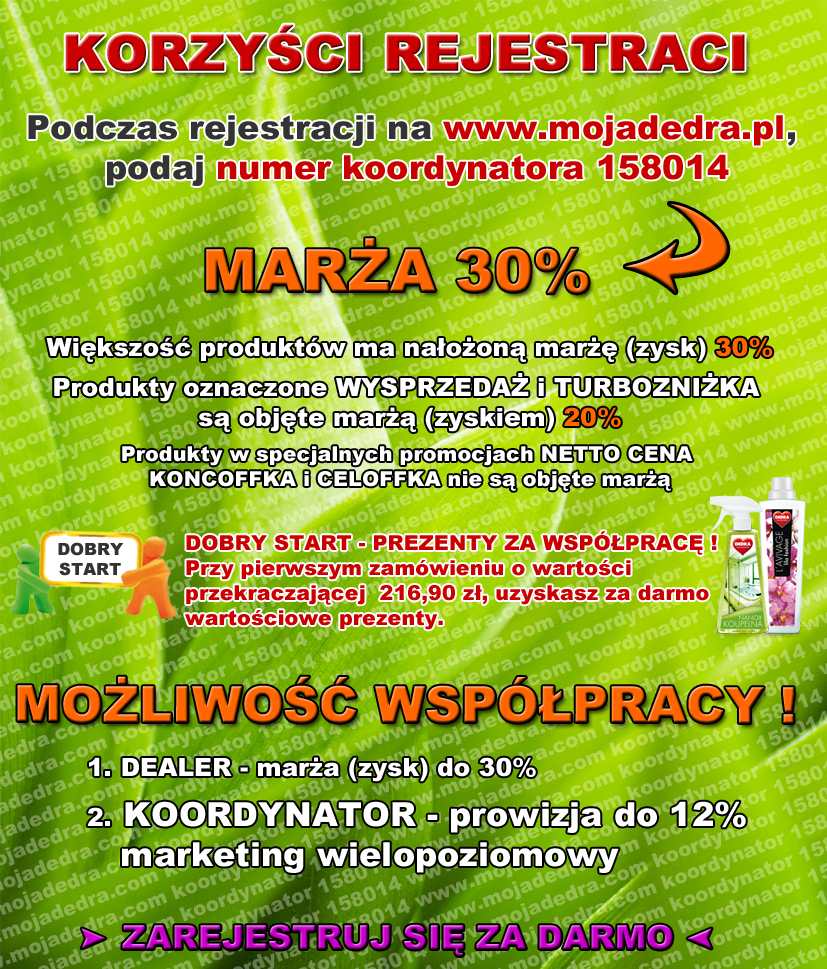 By uzyskać rabaty na zakupy albo uzyskać możliwość współpracy, podaj podczas rejestracji na www.mojadedra.pl numer koordynatora 158014.